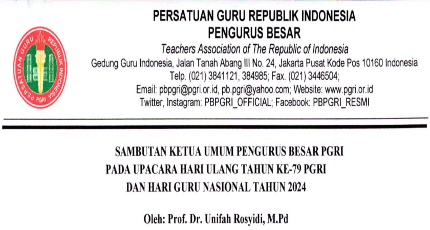 SAMBUTAN KETUA UMUM PENGURUS BESAR PGRI PADA UPACARA HARI ULANG TAHUN KE-79 PGRI DAN HARI GURU NASIONAL TAHUN 2024